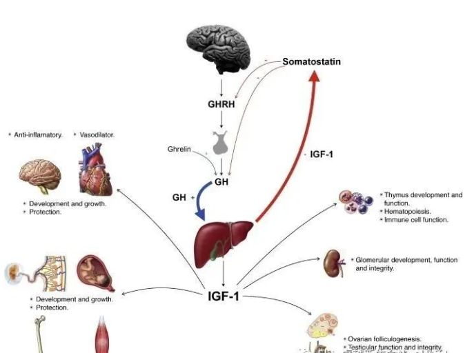 生长激素从脑垂体释放后,在血液中只停留几分钟,然后进入肝脏,介入新陈代谢,然后会转换成各种生长因子,最重要的是胰岛素样生长因子(Insulin-Like Growth Factor,IGF1)。
