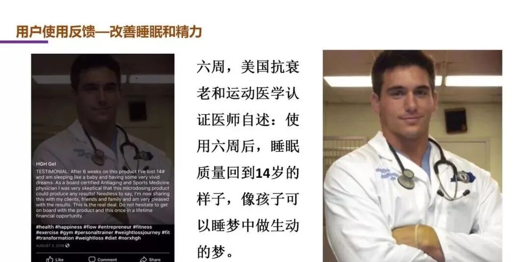 下面这个医生自己使用,六周后就给更多的医生跟病人推荐了该产品。他自己也是产品受益者,睡眠改善了不少。 睡眠问题已经是全球人的共性问题,很多人使用了该产品之后,最大的反馈效果就是睡眠变的非常好,睡眠好了精力就变得非常充沛,这是最明显也是最可喜的效果之一 。