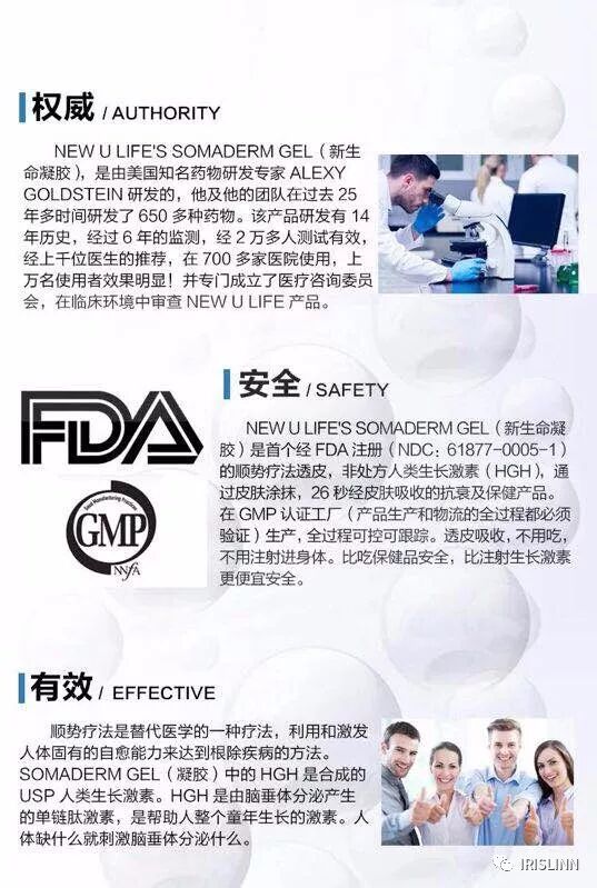 New U Life是美国一家有26年制药的公司,Somaderm人体生长荷尔蒙这款产品已经在美国的各大药房销售了14年了。2018年New U Life从线下搬到了线上,在第一年试营业就吸引了20万美国人代理商,做到了6000万美金的营业额,售出50万瓶凝胶,并且其中有5000位美国各个科室的医生参与,好的产品推荐给他们的病人和朋友。