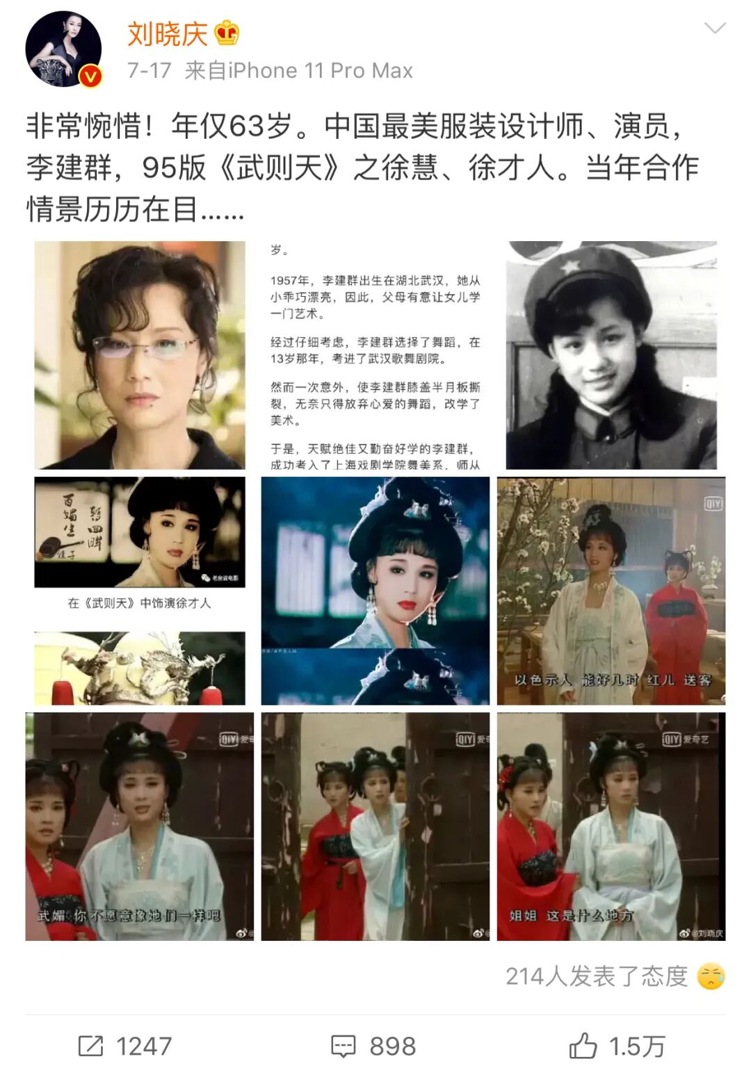 17日午后,悲讯传来,众多业内人士和观众表示深深的惋惜和怀念。曾与李建群一起合作过《武则天》的刘晓庆发文沉痛悼念:“非常惋惜!”