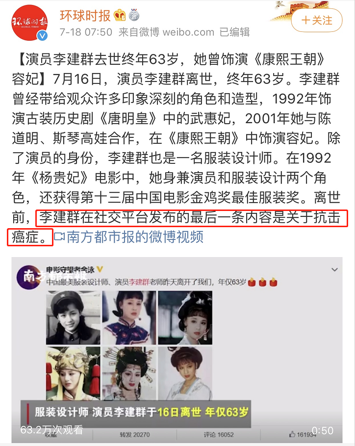 2019年10月,李建群因多发性肿瘤入院化疗,今年4月底在武汉完成了肿瘤切除手术。尽管病痛缠身,她仍经常称自己会积极应对,连去世前最后一条微博都是关于抗击癌症...
