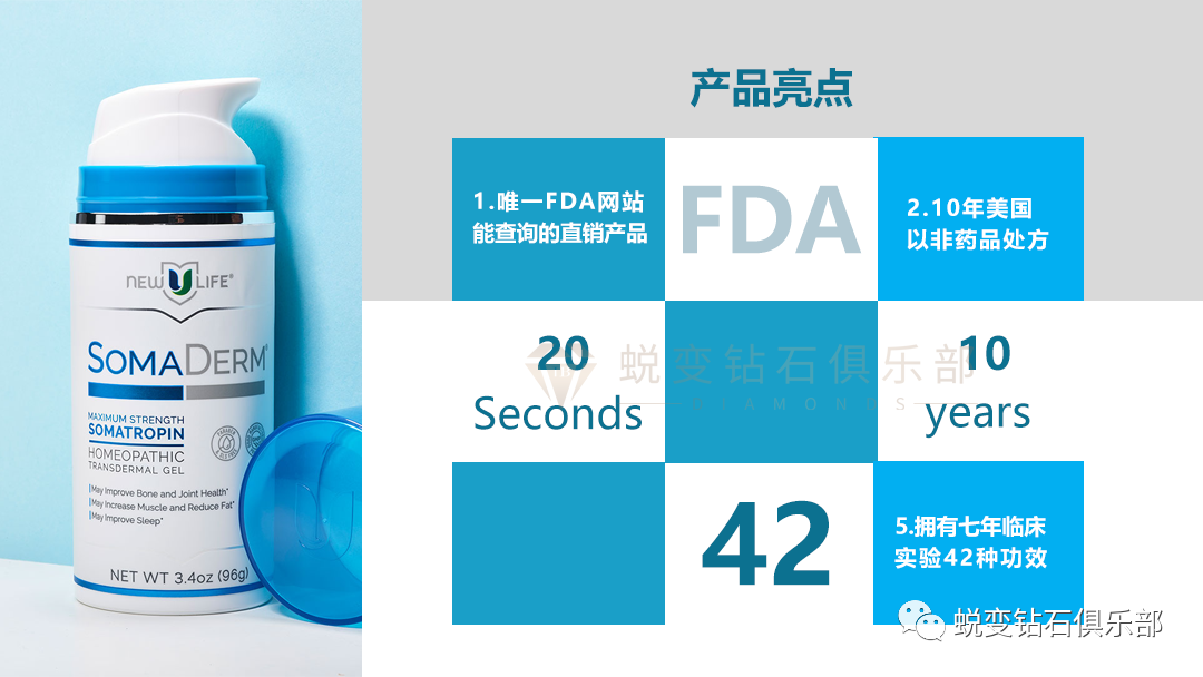 SOMADERM(HGH)凝胶,世界最先进最科学最安全的抗衰老产品,也是不用吃的的保健品,只需抹在手臂内侧皮肤上,26秒迅速进入血液, 让我们每天都能补充需要的HGH,同时循序渐进地激活我们的脑垂体,使我们的机体新生。因而它是目前最先进最科学最安全的HGH产品,也是我们的最佳选择。