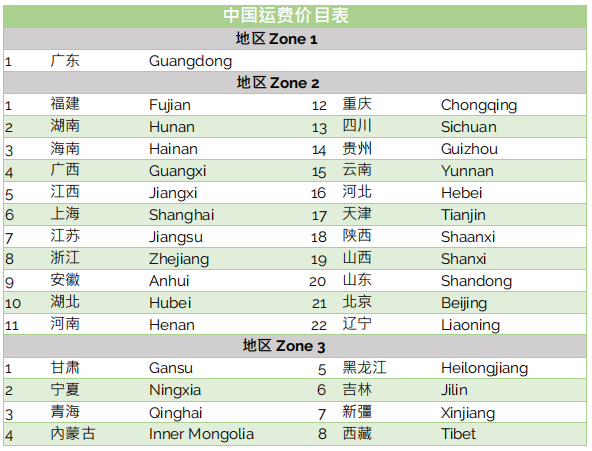 2. 地区运费价目表