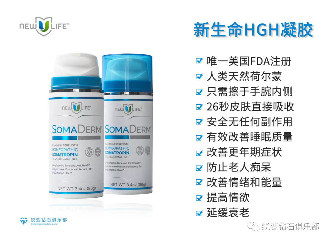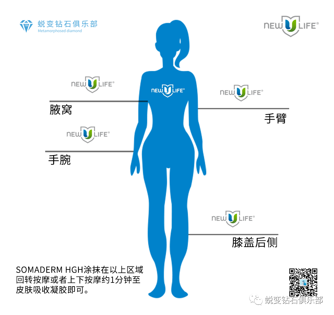 SOMADERM“小蓝瓶”,不用吃、不用喝、无需注射的产品。唯一一款经FDA注册顺势疗法透皮,非处方,人类生长荷尔蒙产品。SOMADREAM凝胶始终应用于皮肤的薄薄区域,通过静脉血管微量吸收到血液中,有手腕, 肘窝, 腋下, 膝盖后,每次涂抹一个对应的位置,一天涂抹两次。