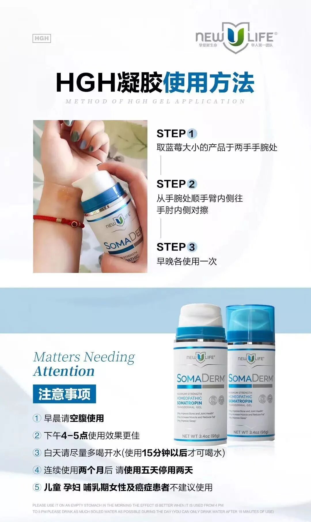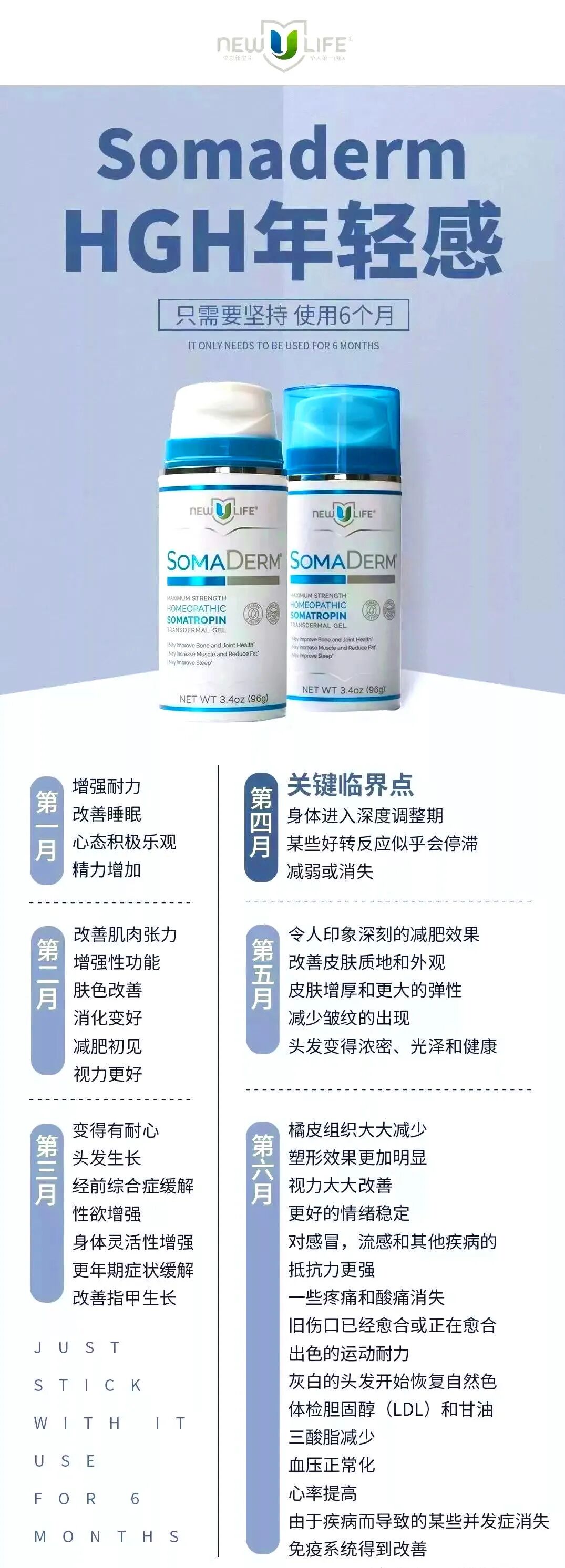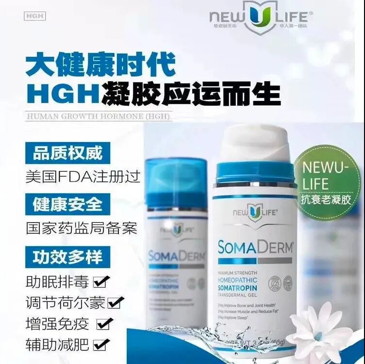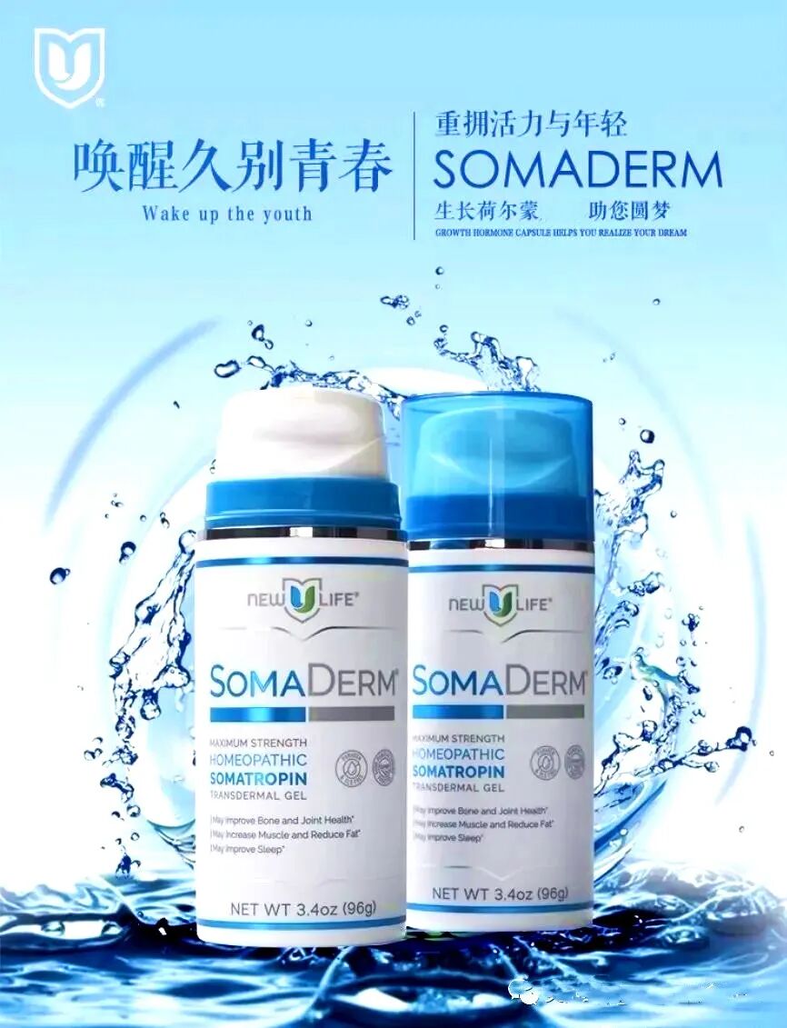 新生命 (New U Life) 推出的 SOMADERM 抗衰老凝胶是严格使用顺势疗法理论及技术稀释主要成分制作的凝胶 (Homeopathic HGH),绝对不是类固醇,100%安全,经美国FDA注册,不需医生处方,透皮吸收直接到达血液中,再深入到细胞层,是同类产品中最有效用的。