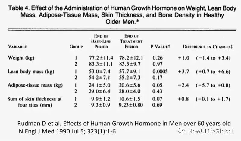 前文提到,随着年龄的增长,生长激素会自然下降,生长激素太低,会导致肌肉萎缩和骨质疏松,所以,生长激素与衰老的关系是非常容易理解的。 1990年7月5日,Daniel Rudman罗德曼医师在《新英格兰医学杂志NEJM》上发表了一篇震惊医学界的论文——Effects of human growth hormone in men over 60 years old(人类生长激素在60岁以上老年人中的应用),这个研究,可以说是HGH应用到抗衰老研究医学史上的一座里程碑。 ③这是一个对照研究,第一组注入生长激素组,第二组是对照组,没有注入生长激素,研究进行了六个月,研究结果发现,两组的体重都没有太大的区别,但是你可以看看瘦体重(肌肉)的对比。