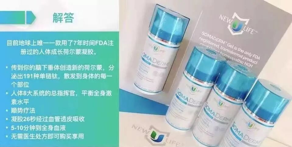 新生命 (New U Life) 推出的 SOMADERM™ 抗老凝胶是目前唯一一款透过皮肤吸收,使用超微剂量HGH(Homeopathic Somaderm) 的淡褐色凝胶,补充并激发脑垂体分泌自身所需之生长荷尔蒙,100%安全,100%合法,美国FDA注册,GMP认证,美国药品局7年监测,无需医生处方。