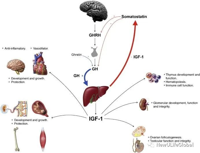 几乎所有成长荷尔蒙的功能,包括促进骨骼生长、合成蛋白质、增加肌肉组织、减少脂肪、降低胆固醇、调节葡萄糖、电解质,都必须在 IGF-1 的协同促进下完成。因此有人将 IGF-1 比喻为一种「管道」(channel),因为许多其他的荷尔蒙也都必须和 IGF-1 配合,也就是必须先通过这个「管道」,才能发挥它的正常功能。