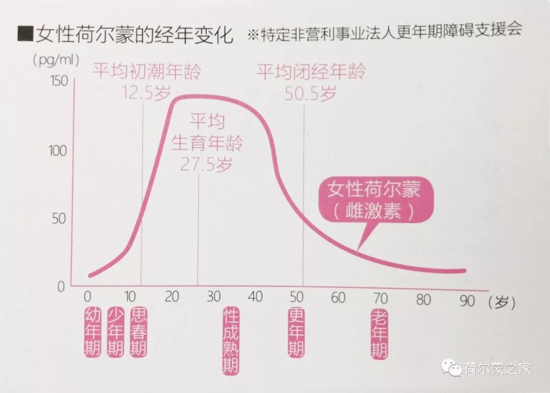 女性荷尔蒙从迎来初潮的思春期开始分泌旺盛, 25岁前后达到高峰,之后的一段时间也会保持较高的状态。 从35岁左右趋于减少。 持续走下坡路的女性荷尔蒙以45岁为界,开始骤减。 到50多岁闭经时,其分泌量就已经微乎其微了(参照下图)。