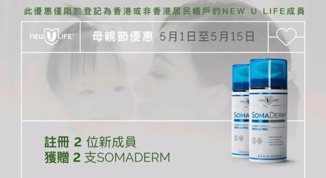 为庆祝母亲节,每为2位新会员注册SOMADERM4支装或SOMADERM8支装,即可免费获赠2支SOMADERM!这是专为每一位出色的母亲以及每一位有母亲的人,或认识一位母亲的人而设!换而言之,每一个人都可以受惠!