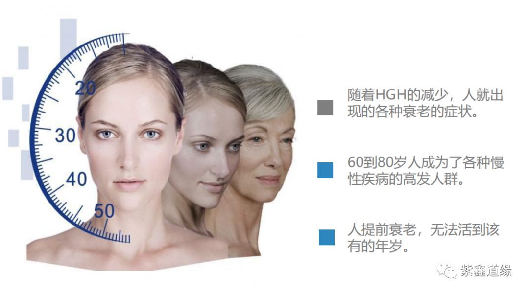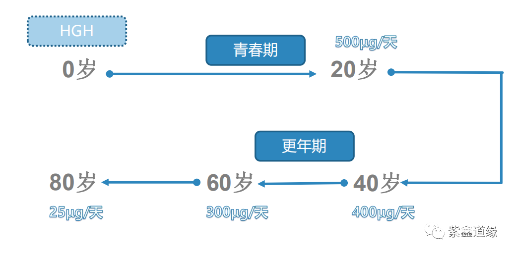 以年龄来划分,HGH在儿童期至青春期分泌量最多,目的是使身体能迅速成长,而这适当的分泌量,将一直维持至20-35岁左右。一旦到达30岁左右,HGH便逐渐减少分泌,而接下来的每10年,HGH就以15%的递减率下降,人体老化的情形随之而来!尤其今日的生活环境里,各种压力、不良习惯及食物毒素所造成的危害,使得HGH加速了减少释放,其分泌量降到难以自足的水平,人类更因此加速了“老化”!