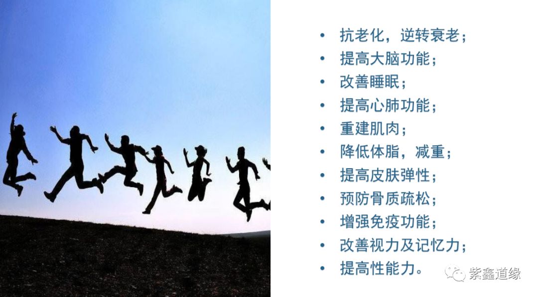 HGH的功效: 1、促进全身胶原蛋白的合成,有效改善皮肤弹性,增加皮肤厚度,改善皮肤松弛下垂提升面部轮廓。减轻消除皱纹,收细毛孔,保持皮肤细致光滑,淡化色斑。使毛发再生,使白发变黑,改善发质。 2、能够增强改善性功能及促进性欲,增加大龄人群受孕几率。 3、改善脑功能,改善睡眠质量,有效治疗失眠,增强及恢复记忆力,预防老年痴呆,改善情绪,提高精力体力,消除疲劳。 4、提高机体免疫功能,增强预防抵抗疾病能力,尤其降低肿瘤的发生率(美国癌症协会研究发现,95%的疾病和免疫有关,使用年轻驿站半年后,人体免疫力提高10%,癌症发生率降45%,肝炎肺炎等传染性疾病。发生率降低52%,感冒发生率降低66%,身体呈现年轻态 。 5、促进伤口愈合,减轻水肿,预防瘢痕,预防感染。 6、分解脂肪,调节脂肪分布,增加肌肉含量,减脂塑形,维持体态的综合平衡。 7、降血脂、降胆固醇,纠正糖脂代谢紊乱,预防改善糖尿病并发症。 8、促进全身蛋白合成,激活体内干细胞,选择性修复器官损伤细胞,使衰老细胞再生,全面提高和改善各脏器功能。 9、全面调节平衡人体内各项激素水平。纠正内分泌失调、有效改善更年期综合征。 10、预防骨质疏松。延缓关节、椎间盘退行性变,增强运动能力。 11、增强心机收缩,预防猝死,预防脑血管意外,有效促进神经功能康复。 12、延缓卵巢功能衰退,推迟绝经期及更年期。 适时补充年轻驿站HGH有效缓解各类问题