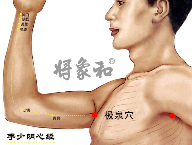 极泉穴在腋窝顶点。用手指弹拨左臂腋窝顶点极泉穴处的肌腱,酸麻感会讯速向手的方向放射,可以在几分钟内缓解心脏不适。极泉穴,放射到中指为最好,也有的放射到无名指或小指。平时敲打腋窝左右各10分钟。
