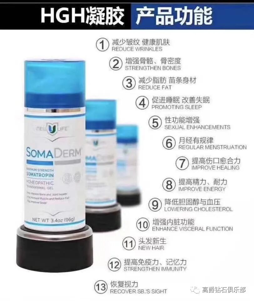 New U Life是一家美国公司,目前首发产品Somaderm HGH凝胶(人体生长荷尔蒙)这款产品已经在美国的各大药房销售了17年,售价320美金。