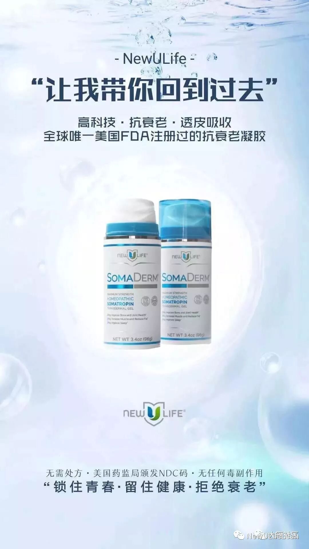 新生命 (New U Life) 推出的 SOMADERM 抗老凝膠是嚴格使用順勢療法理論及技術稀釋主要成分製作的凝膠 (Homeopathic HGH),絕對不是類固醇,100%安全,經美國FDA註冊,不需醫生處方,而且透過皮膚吸收直接到達血液中,再深入到細胞層,是同類產品中最有效用的。