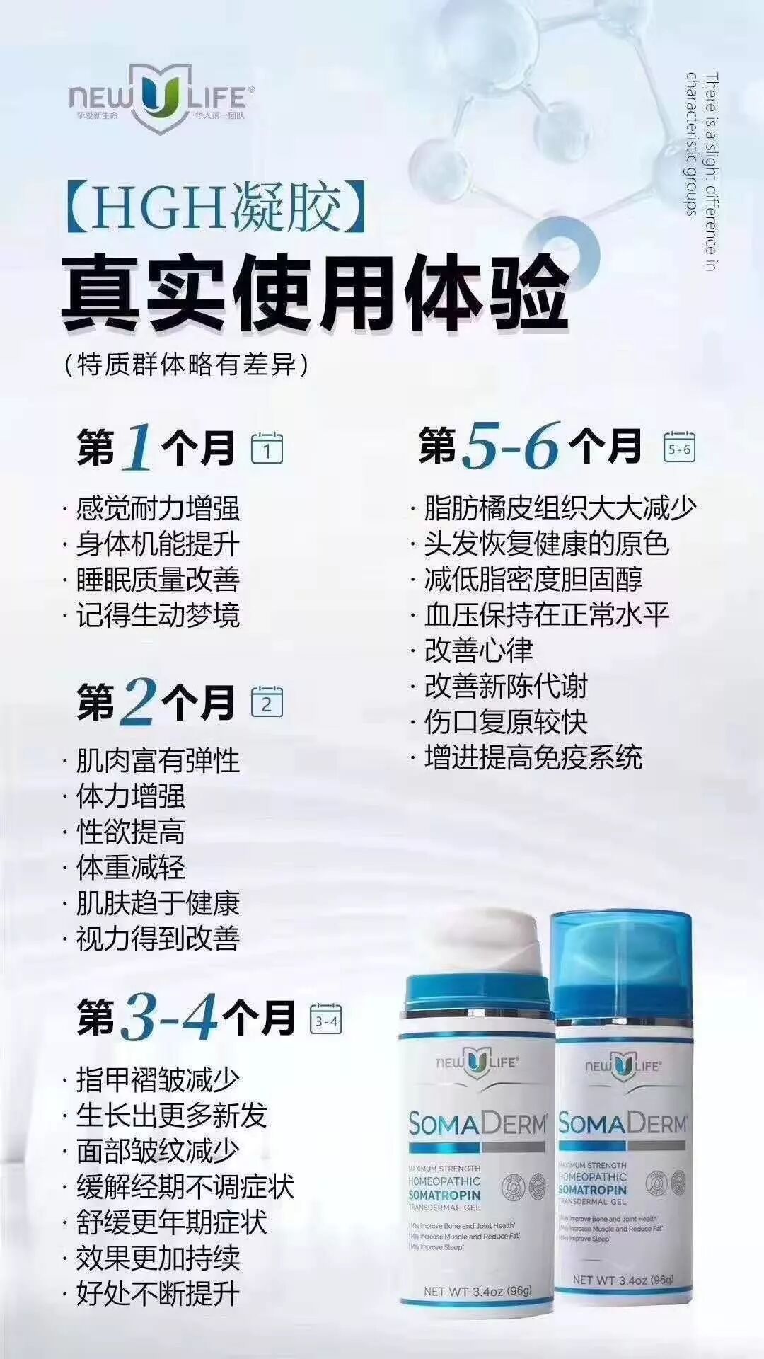 新生命 (New U Life) 推出的 SOMADERM™ HGH凝胶是使用超微剂量HGH (Homeopathic HGH) 的淡褐色凝胶,补充并激发脑垂体分泌自身所需之生长素,100%安全,100%合法,美国FDA注册,GMP认证,美国药品局7年监测,无需医生处方。