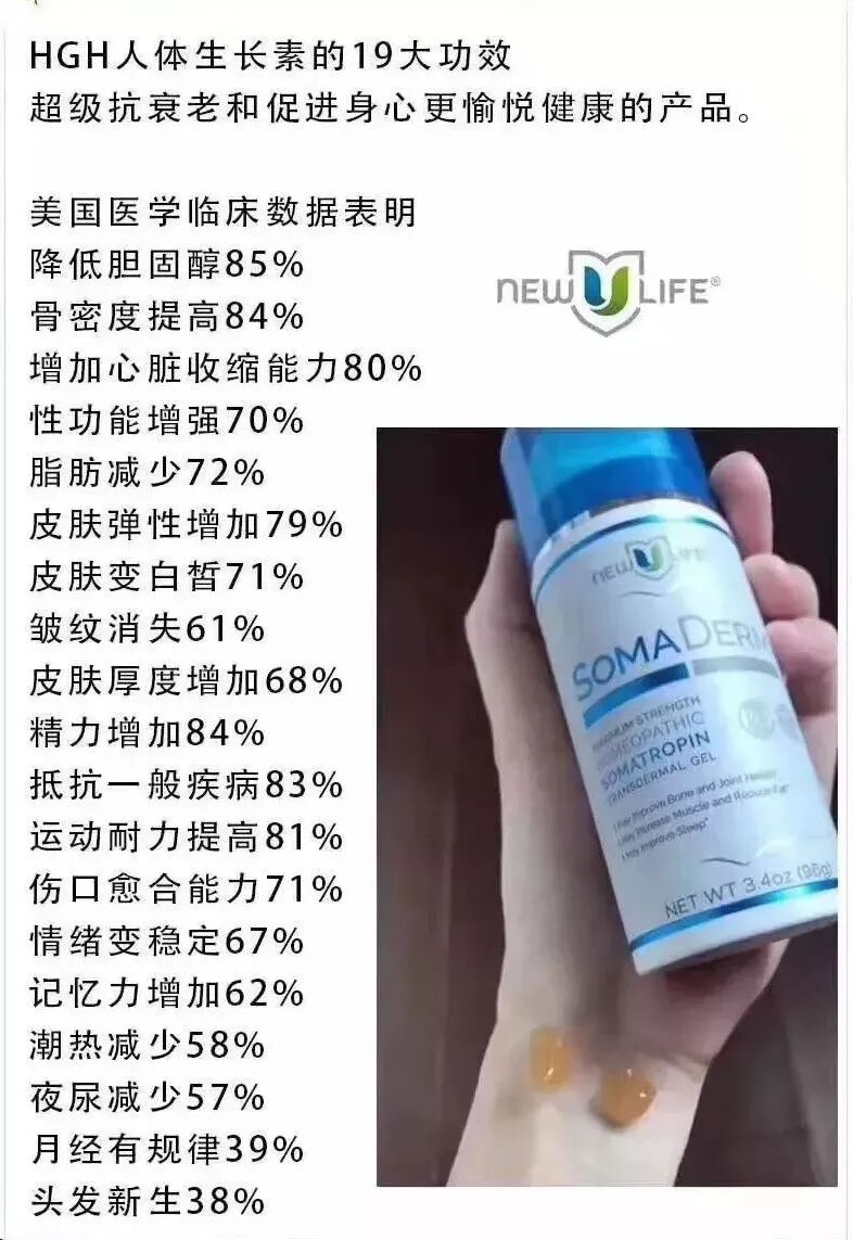 因为一款好的产品能给人类真正带来无穷的贡献,很多人并不了解,说维他命保健品类的根本没有用,实际你吃或不吃,用或不用,真的非常非常的不同。那么,这么多年下来,无数的产品我试用过,但是没有一款产品真正的打动我,直到去年的朋友介绍我这款NewULife新生命公司的HGH凝胶。