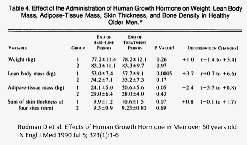生长激素组增加了3.7公斤(8.8%)的瘦体重,脂肪下降了2.4kg(14.2%),皮肤的紧实度也增加了。