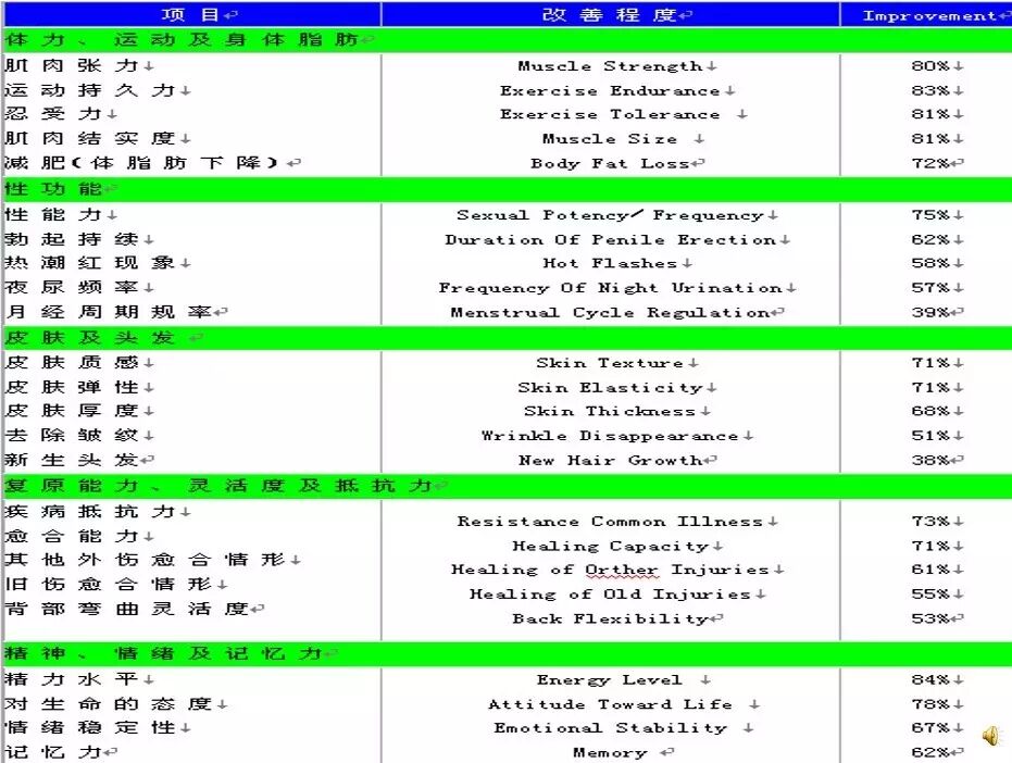 至2005年2万例HGH抗衰老实践研究证实:HGH可带来14项衰老相关征象的改善: