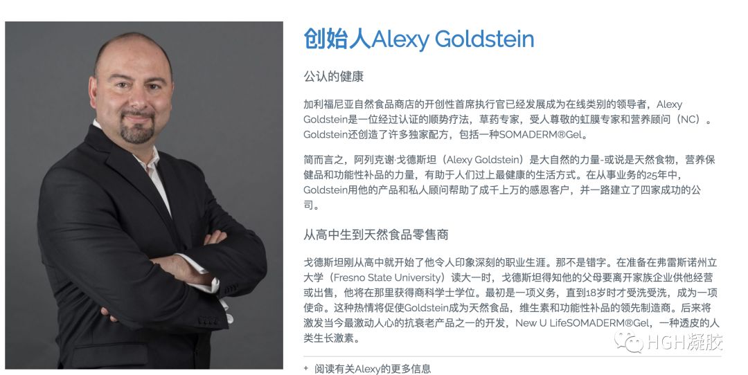New U Life新生命公司的创办人,研发人和CEO Alexy Goldstein来自拥有50年制药经验的家族,是一位公认的健康和保健的创始人,加州天然⻝品开发公司的首席执行官,是一名认证的顺势疗法专家和草药师,是受人尊敬的虹膜学家和营养顾问。