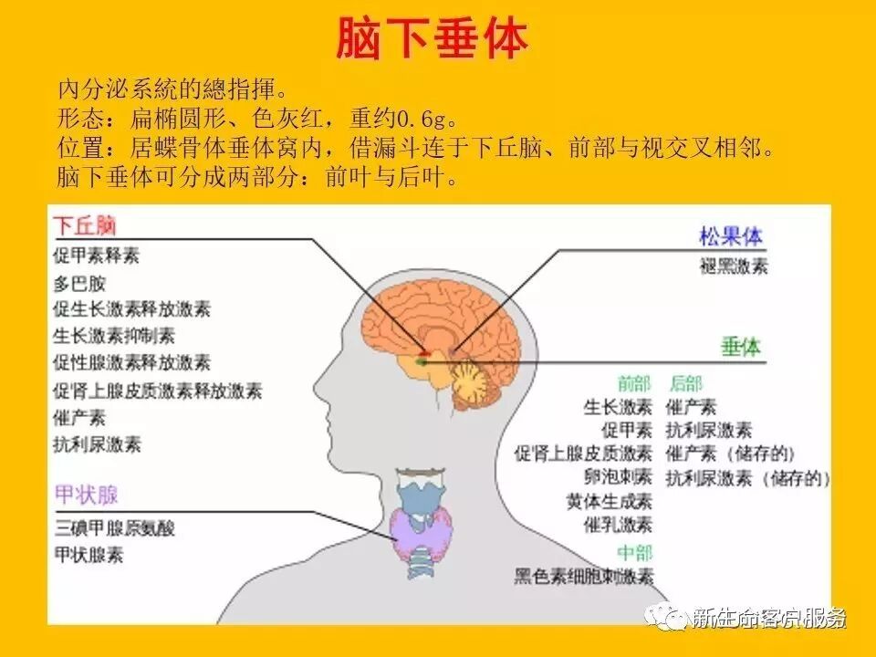 脑下垂体是内分泌系统的总指挥,位于大脑的基底部,通过漏斗状的脑组织连于下视丘的脑区正下方。其中最重要的荷尔蒙是生长激素,分泌出来后进入血液为肝脏所吸收,在肝脏细胞转变成不同的生长激素来进行作用,其中以IGF-l最重要。身体内每一个器官的发育生长,都需要各种形式的生长激素。