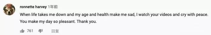 “当生活把我压垮,疾病和年老让我难过时,你的视频可以让我平静到流泪。你让我的生活变得好开心,谢谢”。