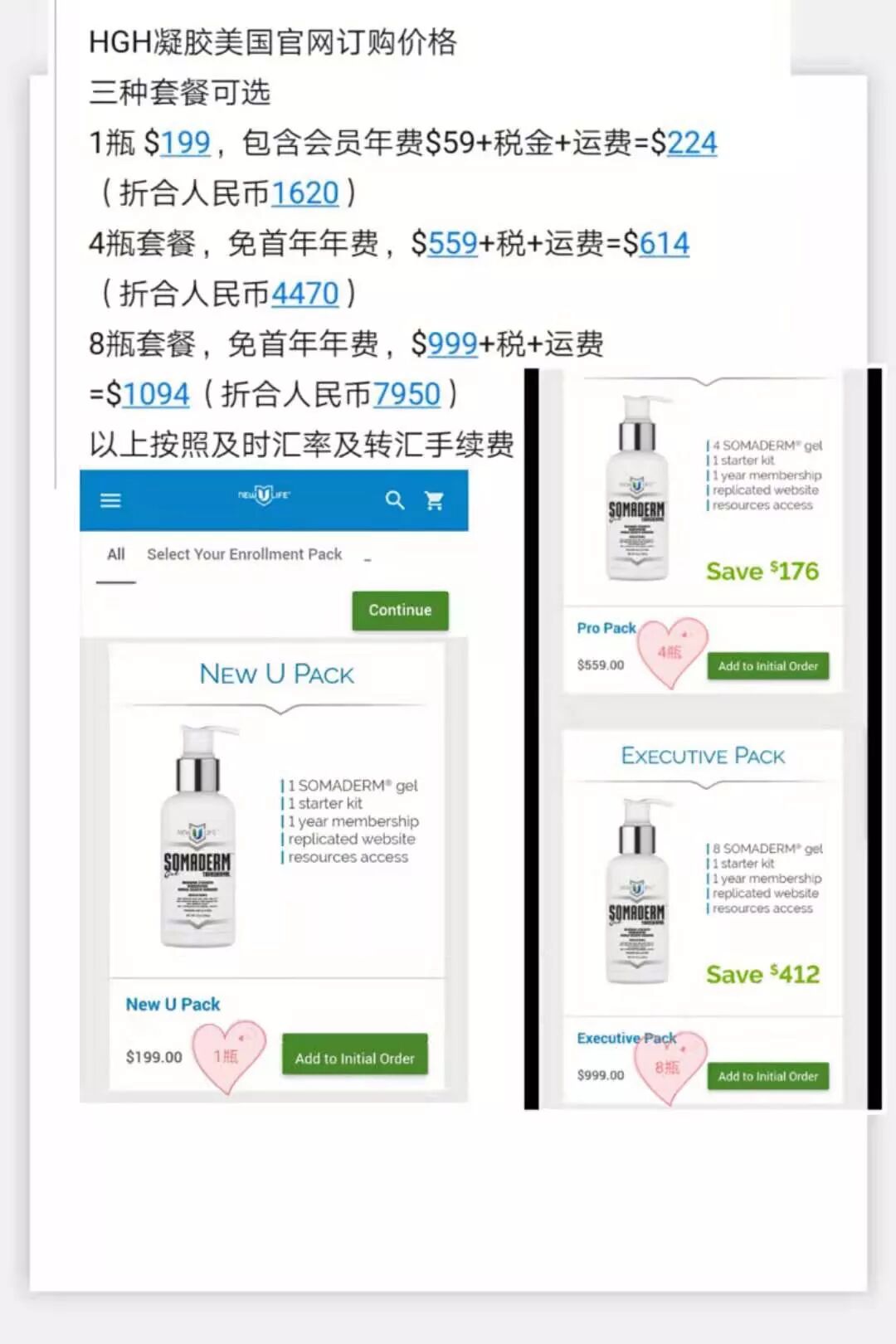 答:美国New U Life新生命公司生长荷尔蒙SOMADERM官方会员价是$140,加盟新会员有三个套餐供选择,分别是$199(1瓶生长荷尔蒙SOMADERM+一年会员费$59);$559(4瓶生长荷尔蒙SOMADERM+一年会员费$59);$999(8瓶生长荷尔蒙SOMADERM+一年会员费$59),以上都是不含美国税费、美国境内运费及美国递送到中国的运费的价格,如果含以上费用,以上三种套餐到国内的总价大约为: