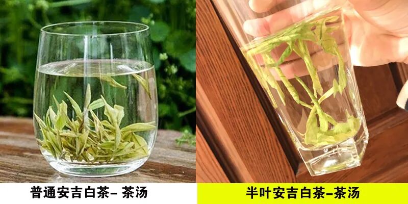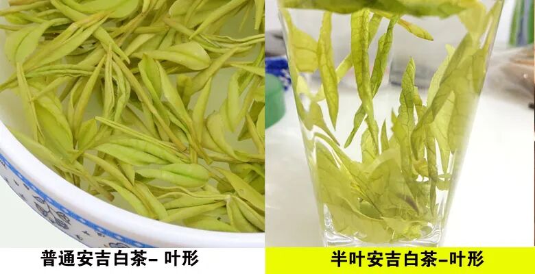 从成品茶形状上看,普通安吉白茶形似松针、呈多叶连梗状,为第一代茶叶;而半叶安吉白茶则形似虫草、呈单叶状,为第三代茶叶。