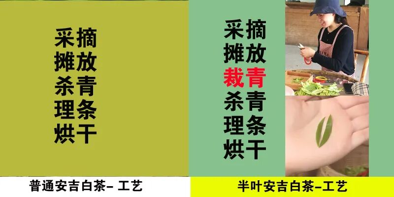 制作普通安吉白茶选用原料青叶为安吉白茶的芽尖,而制作半叶安吉白茶则选用叶片较大较为成熟的安吉白茶青叶,以便于剪除内梗叶脉。