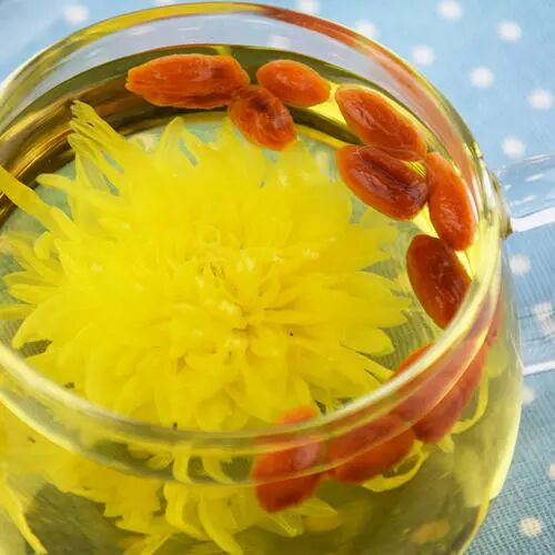 菊花泡茶时可以放入适量的枸杞,菊花枸杞茶可以滋阴补肾,起到益精明目的作用。