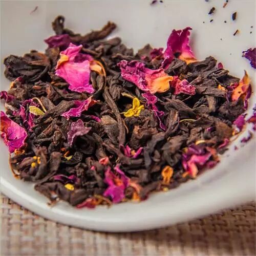 在普洱茶叶中添加玫瑰花、茉莉、桂花、熏衣草等花茶,共同冲泡。