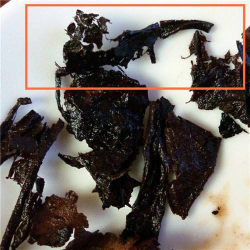 普洱熟茶的叶底多半呈现暗栗或黑色,叶条质地干瘦老硬。如果是发酵较重的,会有明显炭化,像被烈火烧烤过。