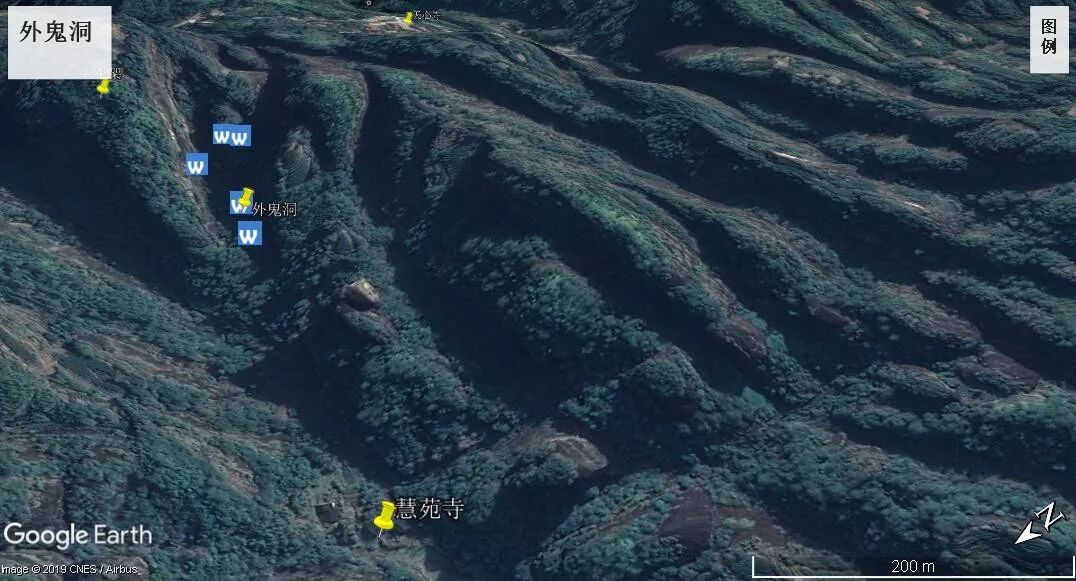 从空中俯瞰鬼洞和外鬼洞,发现他们两确实是连在一起,只是不像通常的峡谷那样一条道的通到底,而是在沿着山势逶迤向下的过程中分出了好几条岔巷,从这一点上来看鬼洞确实有点“鬼”。