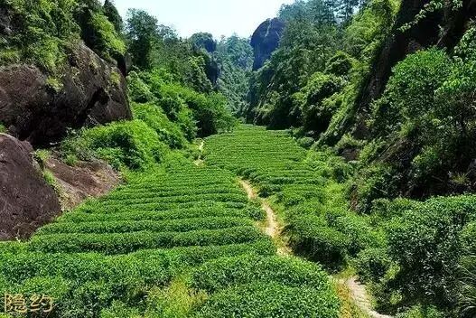 武夷岩茶产区位于北纬27-28度之间,丹霞地貌,峰峦叠嶂,区内岩石多呈红色碎屑沉积。经长期自然风化,加上降水充沛,光温适宜,恰合陆羽《茶经》所说:“上者生烂石,中者生砾壤”。武夷茶区多悬崖绝壁,清顺治后,岩茶复苏,茶农利用岩凹、石隙、石缝,沿边砌筑石岸种茶,有“盆栽式”茶园之称。岩茶区内,有三十六峰九十九岩,行成了“岩岩有茶,非岩不茶”之说,岩茶因此得名。
