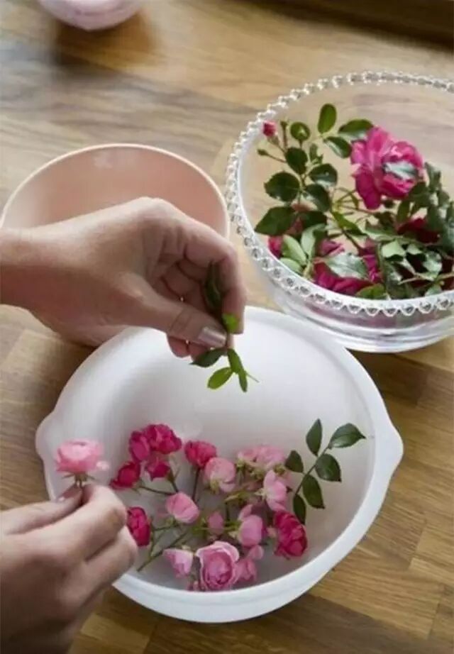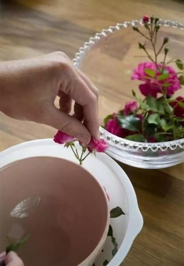 之后,将小碗放入大碗中,在两只碗的空隙里再加入适量的花材。