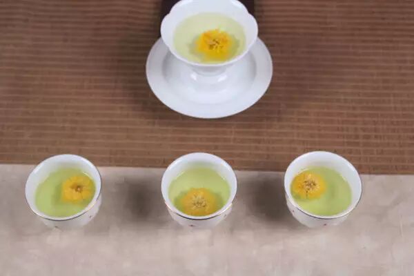 四、冲泡:冲泡黄菊和冲泡名优绿茶一样 ,但是要高温 ,可以先浸润泡一下 ,迅速倒掉水 ,急速冲进开水 ,至(壶)杯容积三分之二即可 。冲泡时可悬壶高冲 ,将水从一边注入。可使黄菊在壶(杯)中翻滚 ,如同菊花仙子在翩翩起舞 ,蔚为美观。