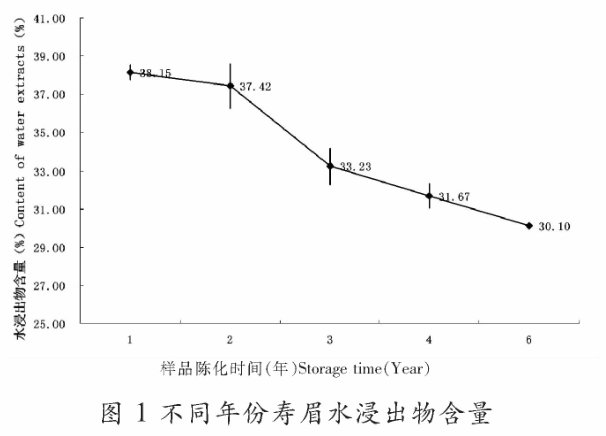 从上图中能看出,随着存储时间的延长,水浸出物含量呈阶梯下降趋势,1年寿眉的水浸出物含量最高,为38.15%,含量最低的是6年的寿眉,为30.10%。因此,在滋味上,老白茶更为淡雅、醇和。