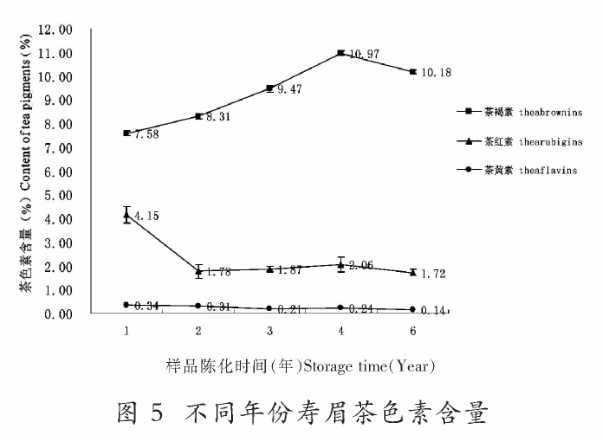 从图中能看出,在五个不同年份的寿眉样品中,茶褐素的含量均比茶红素、茶黄素都要高。