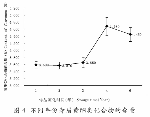 从图中能够看出,黄酮类含量在前三年变化不大,但3年以后,黄酮类含量明显爬升,其中4年的寿眉含量最高,比3年的寿眉高出了28.2%。