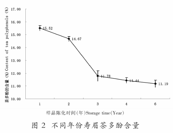 一般来说,茶叶中茶多酚含量可达20%~30%,但是从图中能看出,寿眉中的茶多酚含量比其他茶类略低,含量最高的1年寿眉的茶多酚含量也仅为15.52%。