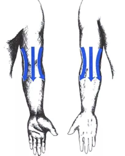 肘窝刮:位置以肘窝部为中心,从上10cm处拉长刮至中心下10cm处,主治发热,咳嗽,咽炎,哮喘,扁桃体炎等。