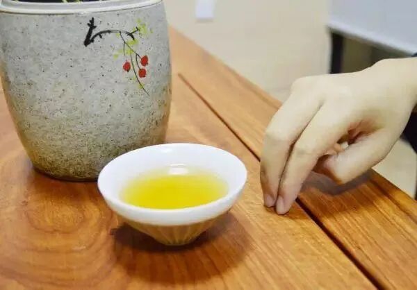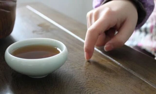 晚辈倒茶时,手掌虚握,伸出食指,轻叩桌面一下,如叩桌面三下,则是表示赞赏夸奖之意。