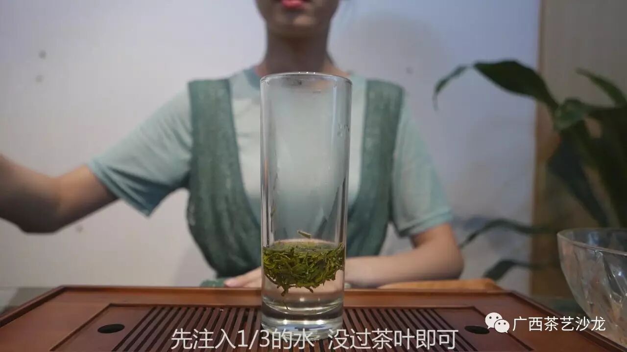 现在就开始教大家用玻璃杯,下投法冲泡西湖龙井。