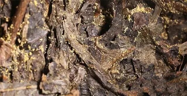 金花的形态是一颗颗的,零零散散地分布在茶砖上,不存在霉丝。在茶叶里比较牢固,不能轻易擦掉;而黄曲霉与白霉成片状共生,有黄曲霉必有霉丝,它们更容易吹走。作为有益菌的金花,与所谓的发霉,是不可混为一谈的。