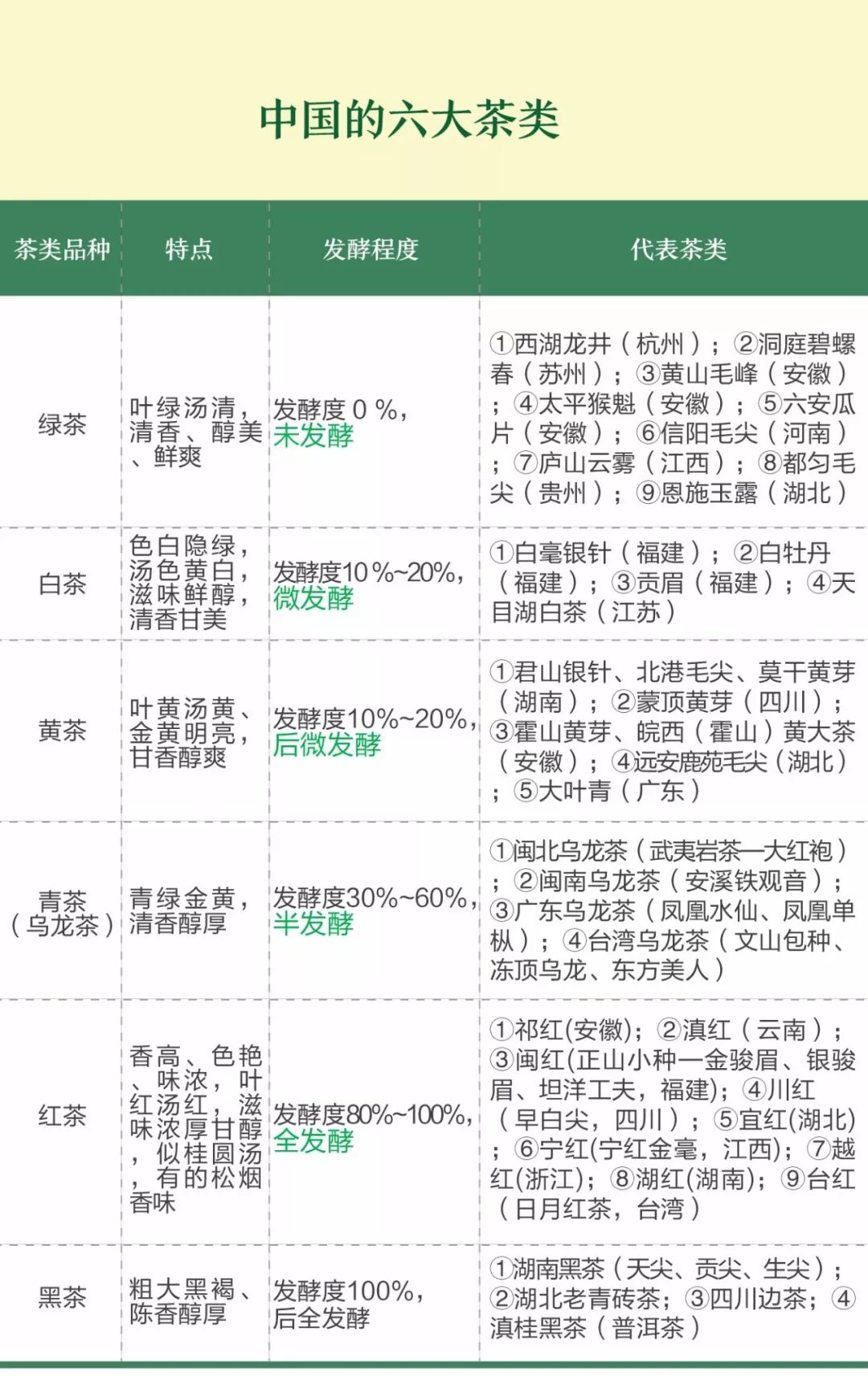 有的消费者对于茶叶分类的界限比较模糊,甚至误以为“铁观音是绿茶”“大红袍是红茶”,但其实,铁观音、大红袍同属青茶(乌龙茶)。根据茶叶的制作方法与茶多酚氧化(发酵)程度的不同,中国茶主要分为六大类:绿茶、白茶、黄茶、青茶、红茶、黑茶。