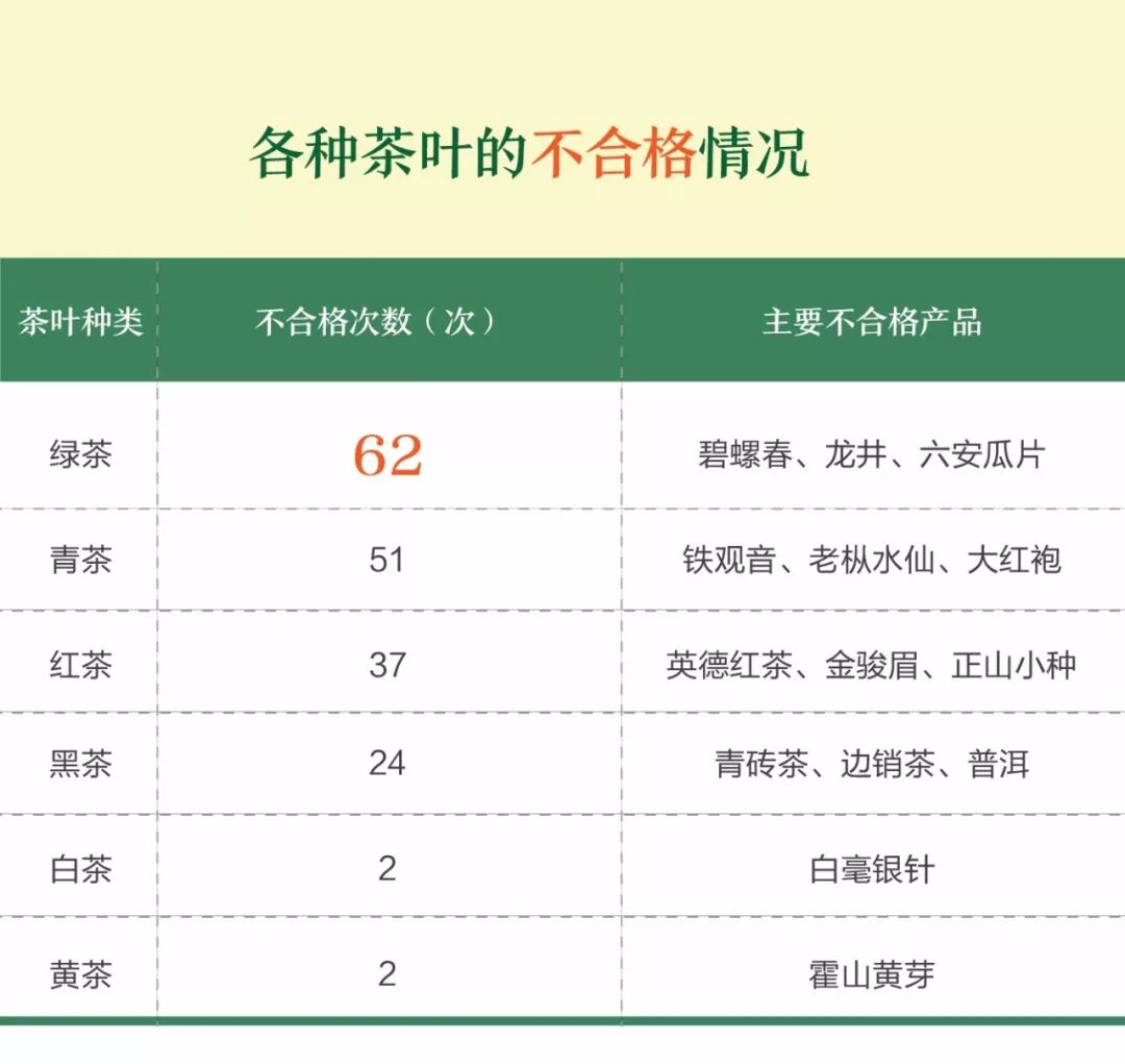 2018年9月,《消费者报道》整理了国家及省级食品药品监督管理局自2014年初至今近5年关于绿茶、红茶、青茶、黄茶、白茶、黑茶六大类茶叶的质量抽检信息。