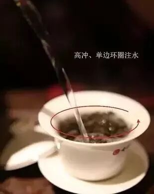 需要提醒的是,如果注水点在盖碗壁上,那将注水点放在盖碗和茶底之间,会融合得更好些。这种注水方式适合需要出汤很快的茶,或者碎茶。