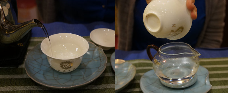 润茶约5秒钟后出汤,每次出汤均确保出净,盖碗底部不留茶汤。同时要注意确保茶叶平置于盖碗之内,若是偏向一侧可在茶巾上轻敲盖碗底部进行调整。