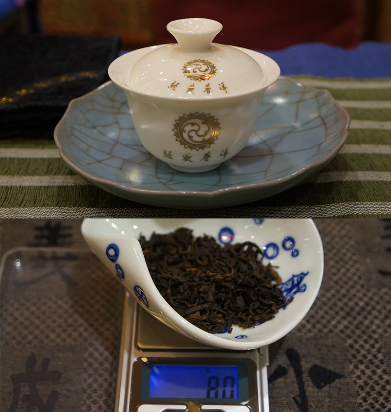 一般在冲泡散熟茶时我们采取1:12的茶水比。比如本次冲泡使用的是容积为100cc的盖碗,故而取茶8g。茶友还可根据自己的口味适当进行调整。