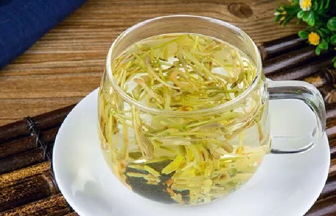 制作方法:取10克金银花洗净,倒入大杯中,放入3克绿茶,冲入开水,盖上杯盖焖10~15分钟,揭盖,凉至温热饮用即可。